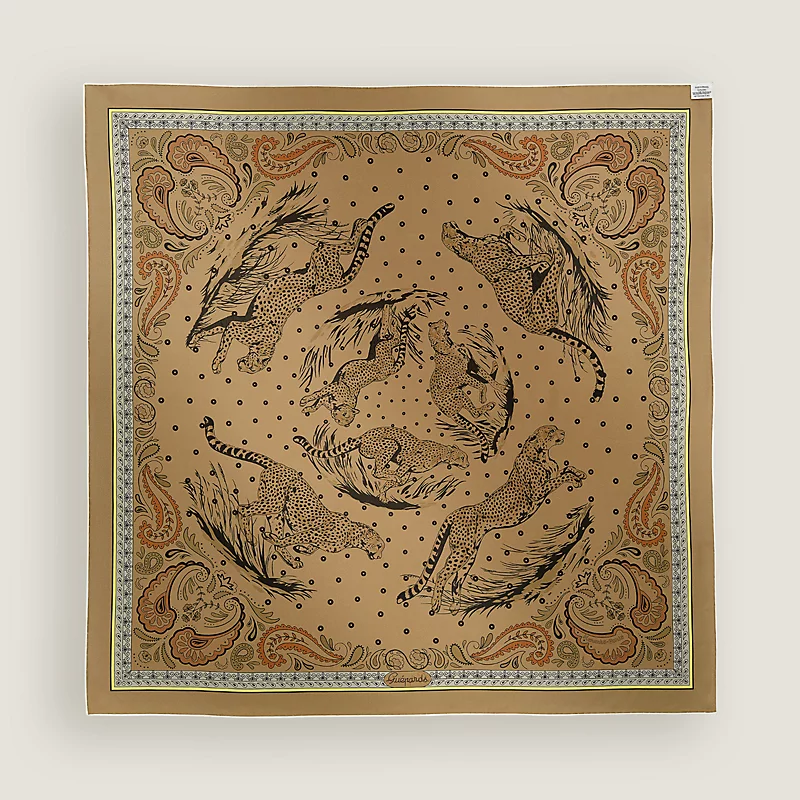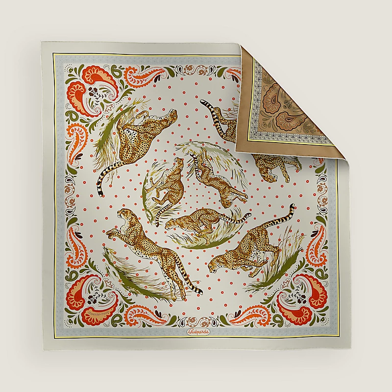 HERMES Guepards Bandana double face scarf 90 gris perle / orange cuit / kaki