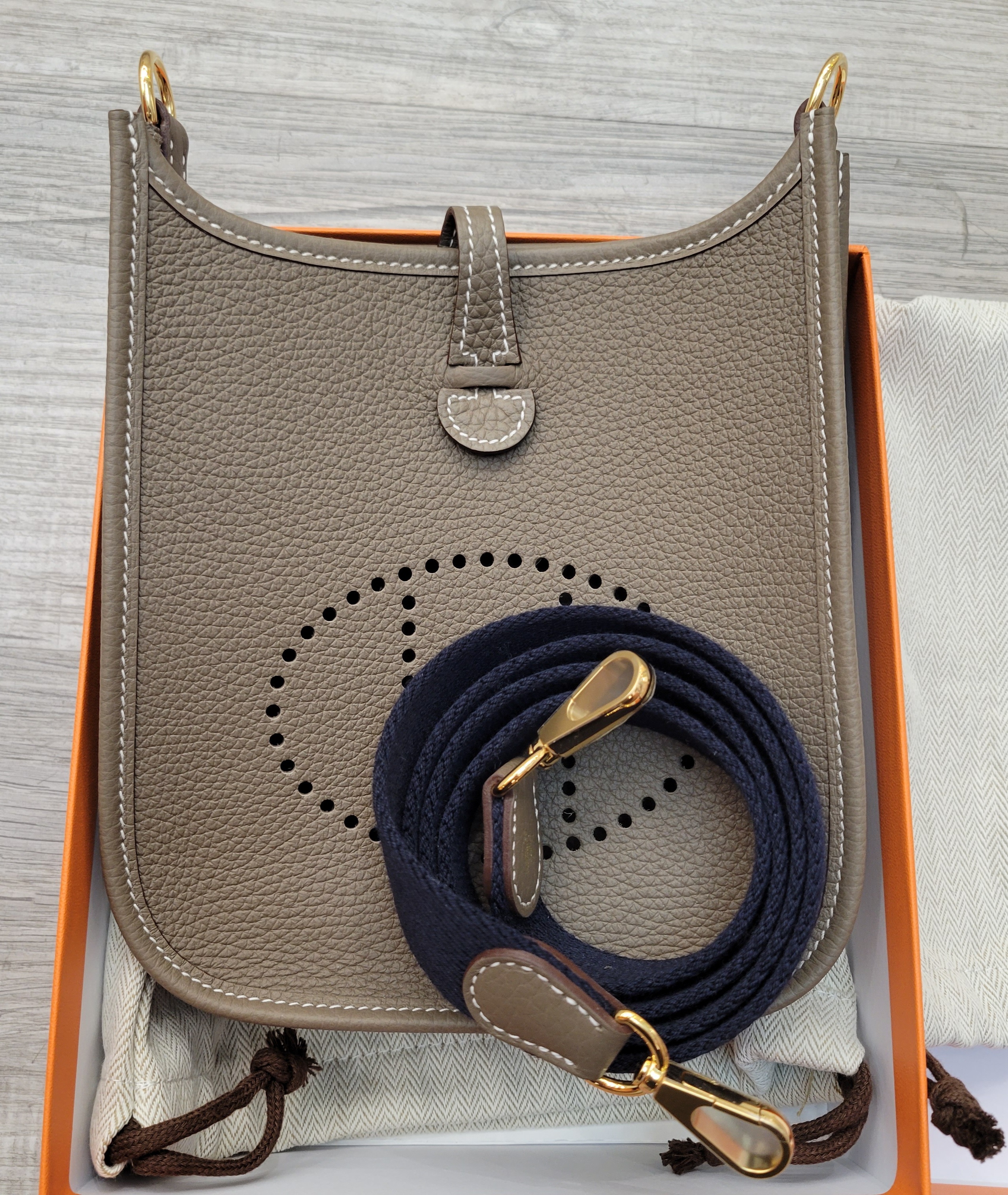 HERMES MINI EVELYNE ETOUPE/BLEU INDIGO CC 110CM 大象灰藍肩带金扣