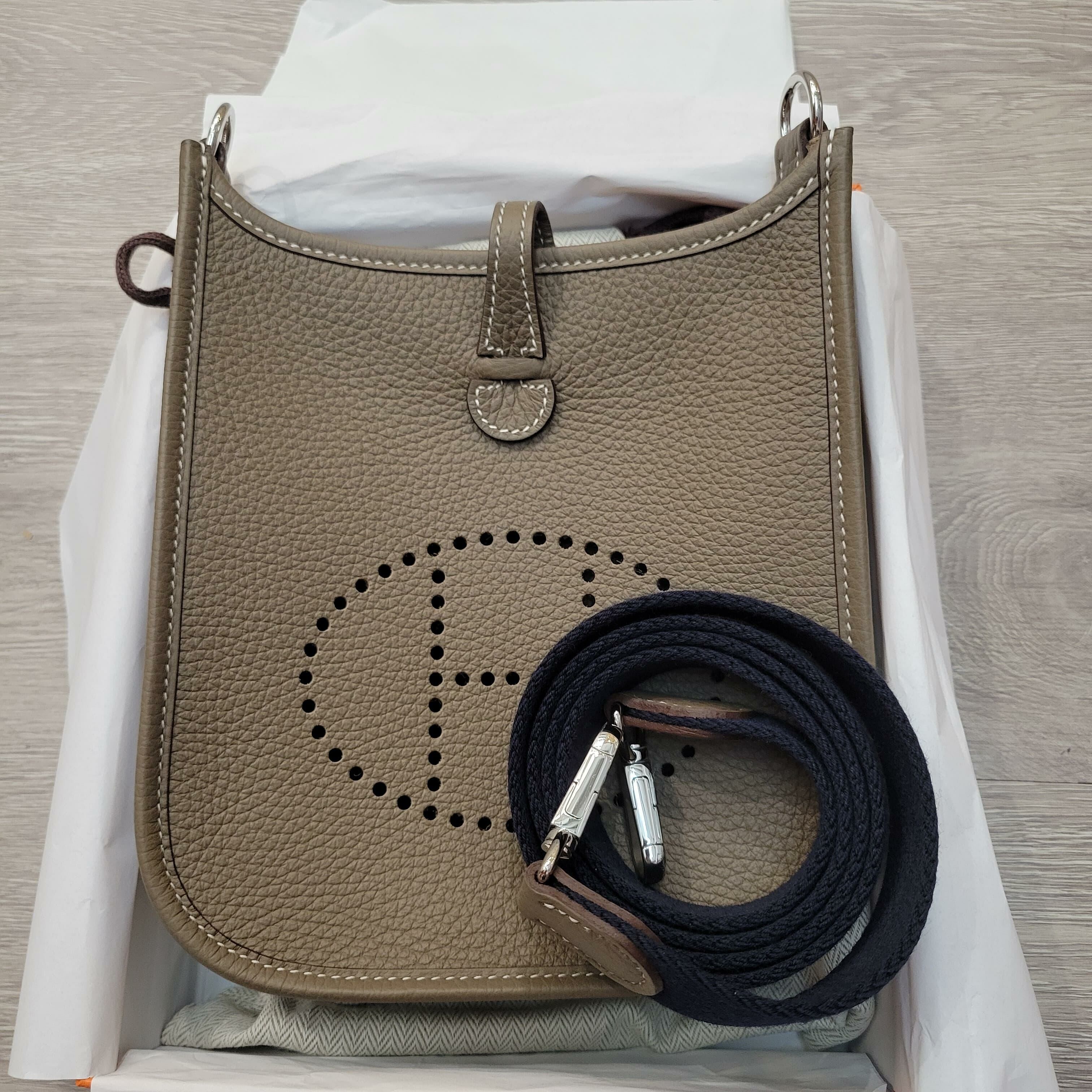 Hermes Mini evelyne Etoupe/bleu indigo CK 110cm 大象灰/藍帶銀扣